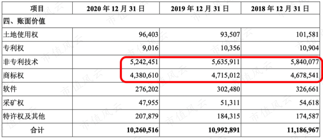 (无形资产中非专利技术和商标权占比最高,其中商标权不折旧只做减值测试)