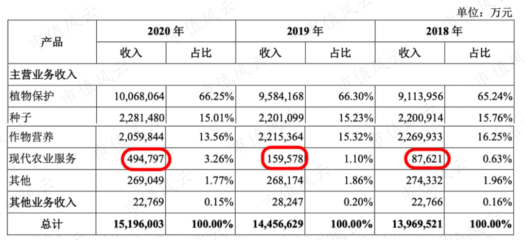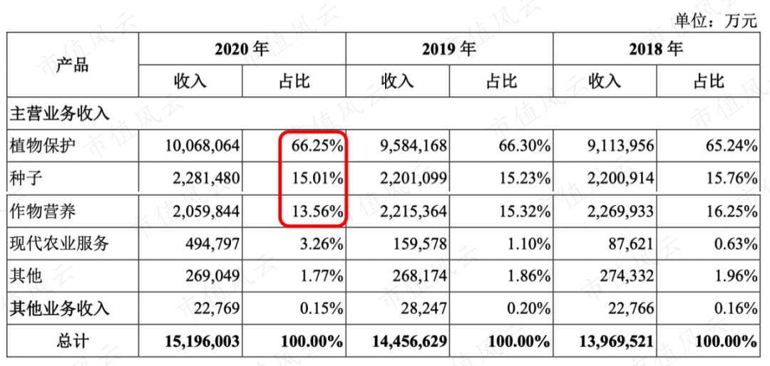 从收入业务来看,植物保护(农药)、种子、作物营养(化肥)贡献了95%以上比例。