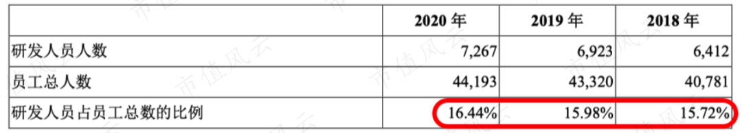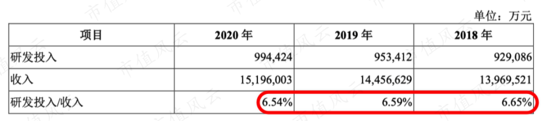 2018年-2020年研发投入为92.9亿、95.3亿、99.4亿,比净利润还高,每年研发投入比例在6.5%左右。