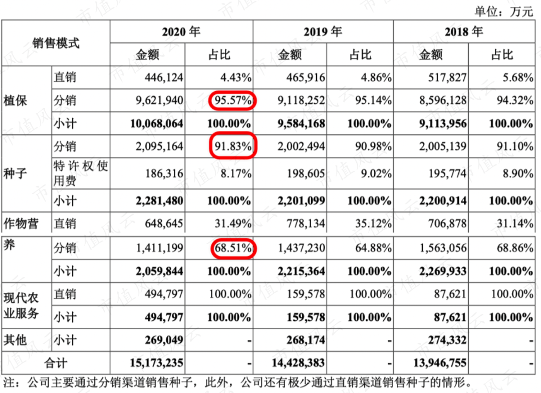 先正达基本以分销为主,无论是植保业务、种子业务,还是作物营养业务,现在农业服务全是直销,但占收入比例极少,因此整体上分销模式收入占比70%以上。