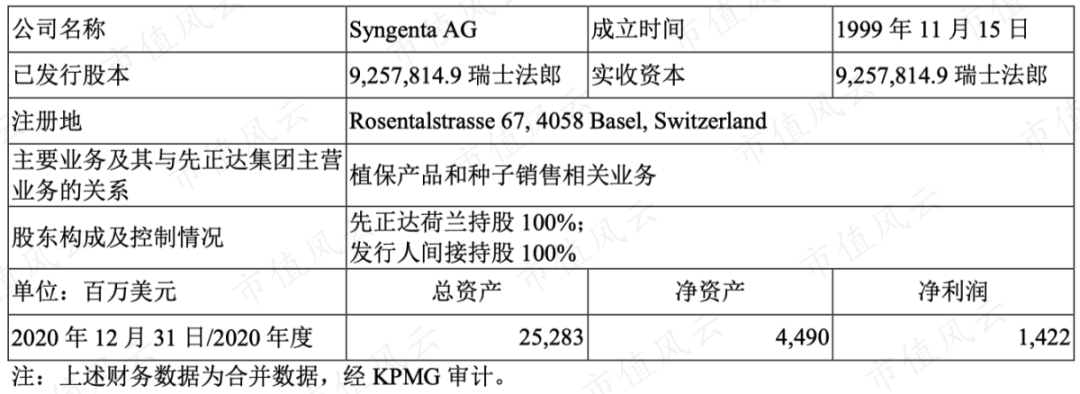 先正达最重要的子公司即瑞士先正达(先正达起名的来源),2020年的总资产是252亿美元,净利润是14.22亿美元。