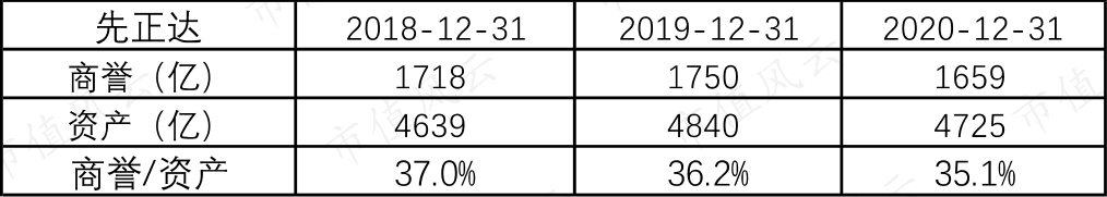 也正式因为如此,先正达的财务报表中资产科目最大的也是商誉:2020年有1659亿,占了当期总资产的35.1%。