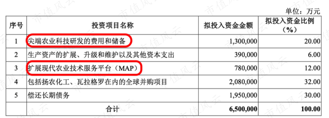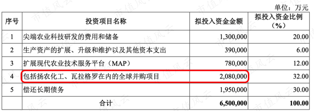 先正达650亿募集资金用途中,占比最大的也是用于未来并购,预计金额有208亿,包括扬农化工(600486.SH)、瓦拉格罗在内的全球并购项目。