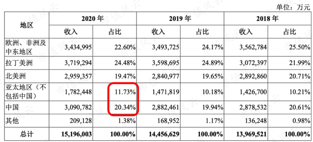 因此,销售网络也是全球布局、遍布100多个国家,其中亚太地区(假如包括进中国)销售最多,其次是拉丁美洲。