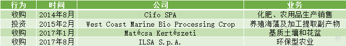 收购Cifo SPA,借助于它下沉到市场的终端销售力量,来拓展本土业务。收购West Coast Marine-Bio Processing Corp,借助它本身在海藻养殖和副产物(海藻酸是一样被证明功效的生物刺激素)的提取工艺上所拥有的力量,为自己在生物刺激素领域的领先地位助力,并且希冀于通过West Coast Marine-Bio Processing Corp开拓北美市场。收购Matécsa Kertészeti,借助其在家庭园艺的上的多年业务开展,进一步拓宽Biolchim的产品销路和客户群体。收购ILSA S.p.A,借助它在环保型农业上取得的成就,改良自身产品质量和品控,加强创新力量,保证产品的创新型和减少对环境产生的影响。